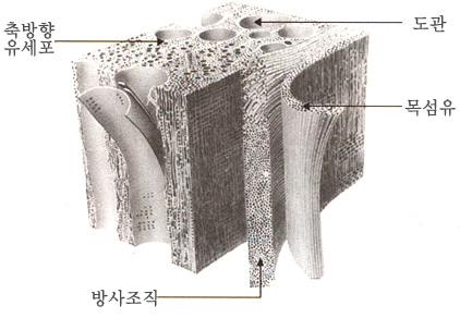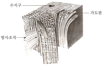 목재의 조직은 침엽수재와 활엽수재에 따라 매우 다르게 구성되어 있다. 침엽수재는 활엽수에 비하여 진화 단계적으로 하등에 속하며 구성세포의 종류 및 형태가 단순한 편이다. 침엽수재를 구성하는 중요한 세포의 종류에는 아래 사진 <침엽수재의 현미경적 구조>에서 보는 바와 같이 수분 이동 통로 및 수체를 강고하게 지지해주는 역할을 함께 수행하고 있는 가도관과, 수평방향으로 양분을 저장하거나 이동시켜주는 역할을 하고 있는 방사조직을 공통기본조직으로 하여 수종에 따라 축방향 유세포와 수지를 유동시키는 수지구 등이 있다.