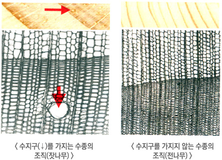 그런데 수지구는 수종에 따라 존재하는 경우가 존재하지 않는 경우가 있다. 즉 소나무, 잣나무, 낙엽송, 리기다소나무, 가문비나무 등은 아래 좌측 사진 <수지구(↓)를 가지는 수종의 조직(잣나무)>에서 보는 것처럼 수지구를 가지지만 전나무와 삼나무, 편백및 측백, 향나무 등의 나무는 아래 우측 사진 <수지구를 가지지않는 수종의 조직(전나무)>에서와 같이 수지구를 가지지 않으므로 목재의 수종을 식별하는데 중요한 식별인자의 역할을 하기도 한다.