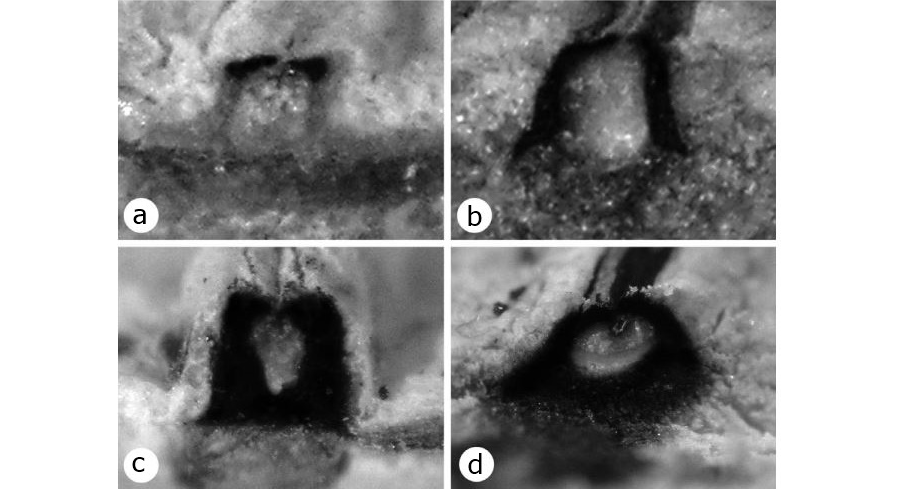 그림 2 여러 형태의 문자의 내부 구조(탄화위치). (a. 꼭대기 부분 탄화; b. 옆면 탄화; c. 전체탄화; d.전체탄화(생장하는 부분과 합쳐짐))
